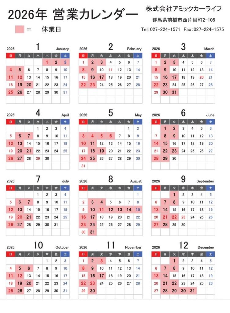 2026年の営業カレンダーをご参照いただき、ご来店をお願い致します。