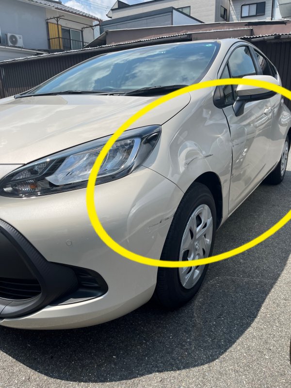 トヨタ アクア フロントバンパー フロントフェンダー フロントドア リアドア リアフェンダー鈑金 修理 塗装 京都市 山科区