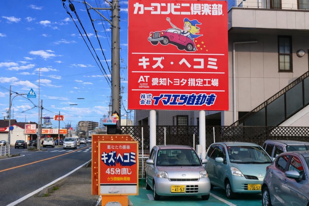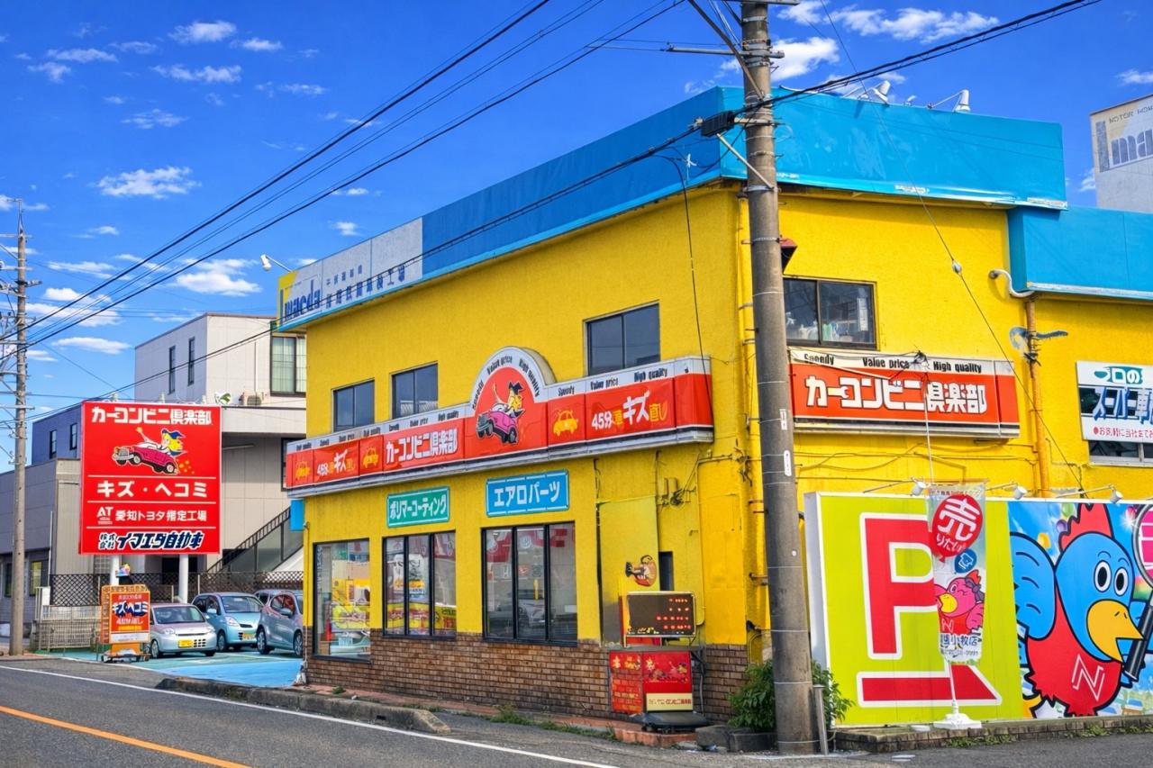 国道155号線沿い(小牧署の有る通り)、ナフコ(スギ薬局)さんの目の前です。黄色の建物に赤いカーコンビニ倶楽部の看板が目印です。