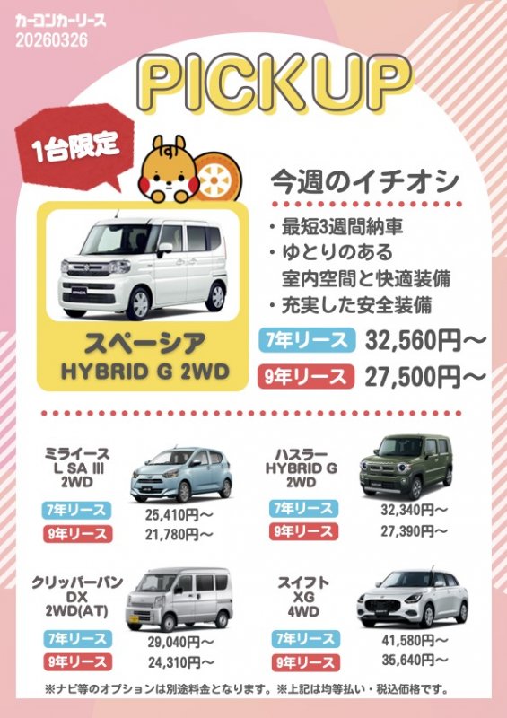 空き状況にもよりますが基本代車は無料でご利用頂けます。