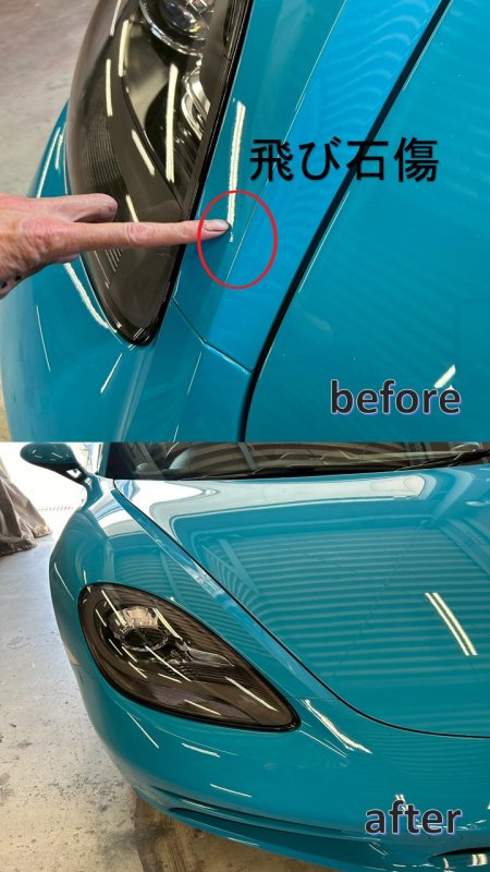 愛知県海部郡大治町|ケイマン(ポルシェ)のキズ・へこみ直し事例(フロントフェンダーキズへこみ修理になります。)
