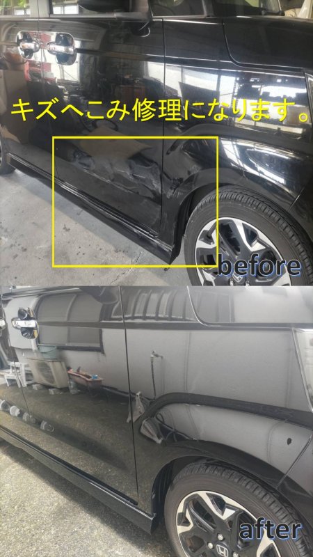 静岡県伊東市|N-BOXカスタム(ホンダ)のキズ・へこみ直し事例(左側スライドドア リヤフェンダー周辺キズ・へこみ修理)