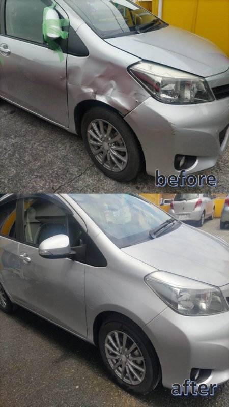 静岡県伊東市|ヴィッツ(トヨタ)のキズ・へこみ直し事例(右側フロントフェンダー交換、ヘッドライト修理、フロントバンパーキズへこみ修理になります。)