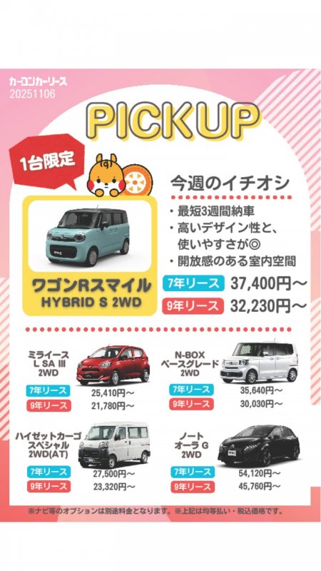 最近、人気のカーリースも店頭で丁寧にご説明させていただきます。お支払いのパターンもいろいろシュミレーションいたしますので、ぜひご相談ください。