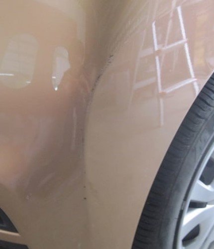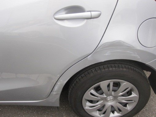 福岡県糟屋郡新宮町|デミオ(マツダ)のキズ・へこみ直し事例(左後ろ タイヤ上(フェンダー) キズ ヘコミ 車 修理 鈑金)