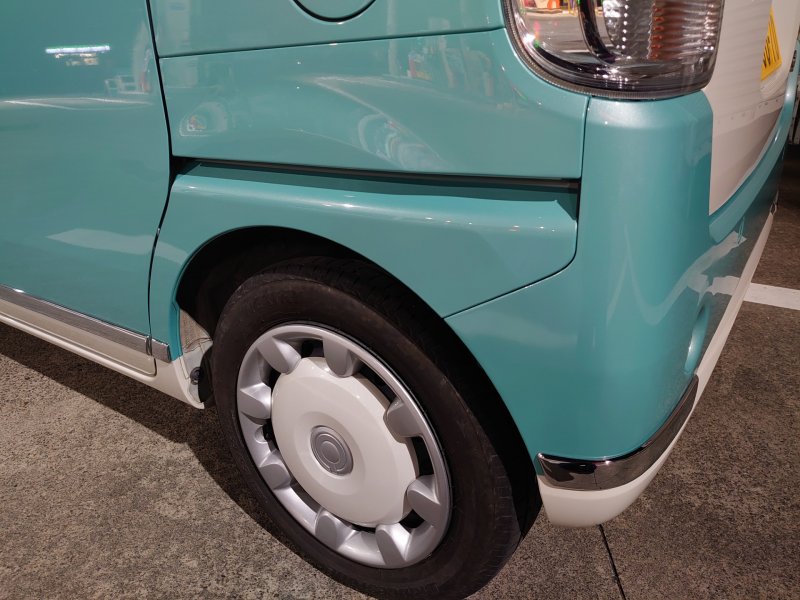 静岡県袋井市|ムーブキャンバス(ダイハツ)の修理・点検・メンテナンス事例(リアフェンダー線キズ、リアバンパーえぐれキズ)