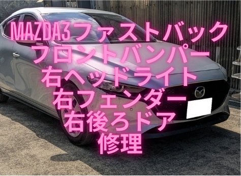 【成田市・富里市・香取市・匝瑳市・旭市】 MAZDA3ファストバック フロントバンパー/右ヘッドライト/右フェンダー右後ろドア キズへこみ修理