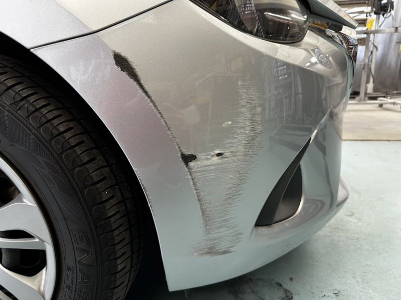 福岡県宗像市|デミオ(マツダ)のキズ・へこみ直し事例(前バンパー キズ ヘコミ 車 修理 鈑金)