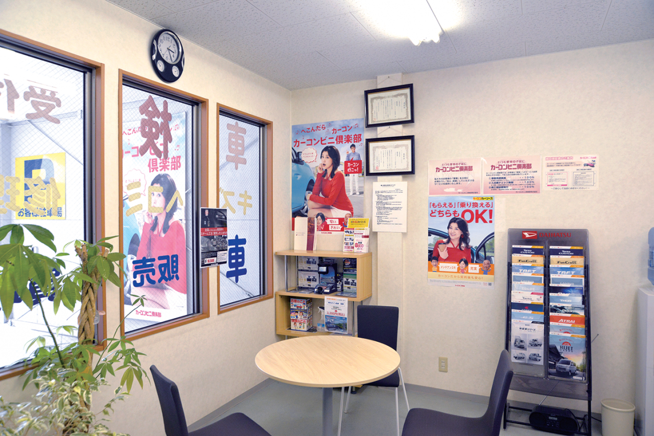 店舗の中に入ると、フロントデスクの壁に掲げられた「カーコン工法マイスター認定ショップ」の証書が目に飛び込んできます。