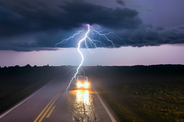 確率は低いですが、ビルなど高い構造物がない場所で雷に遭遇すると、車に雷が直撃する可能性があります。