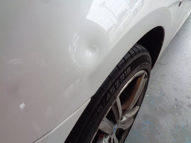 フロントフェンダーのへこみですが写真では分かりにくいのですが深くへこんでいるのでどこに行っても交換と言われてしまい当店へお越しいただきました。交換せずに修理で問題なく対応できましたのでご満足頂けました。