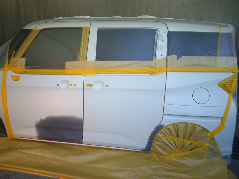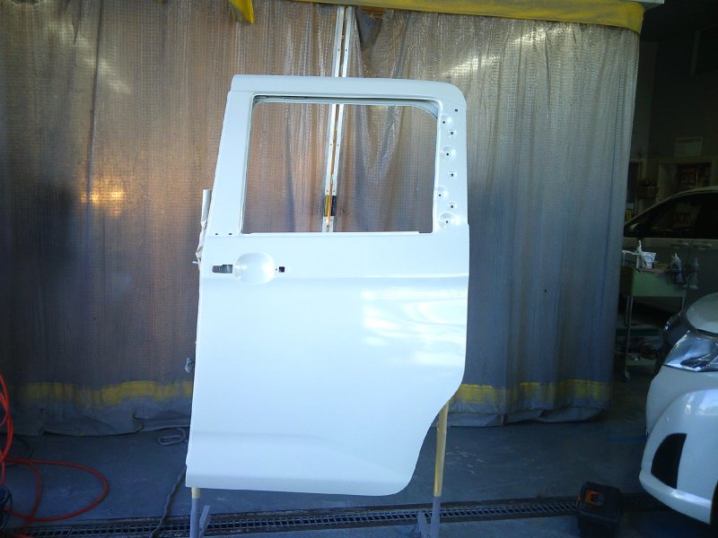 乾燥後に新品ドアを車両に組み付けし、補修した箇所と同時にもう一度塗装します。
