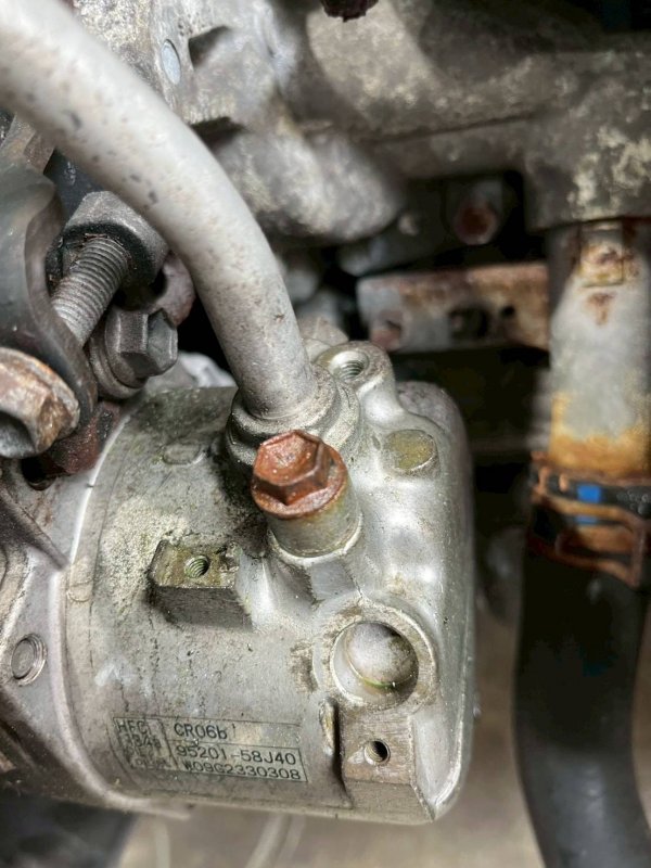 スズキワゴンRのエアコンプレッサーの交換修理の写真です。