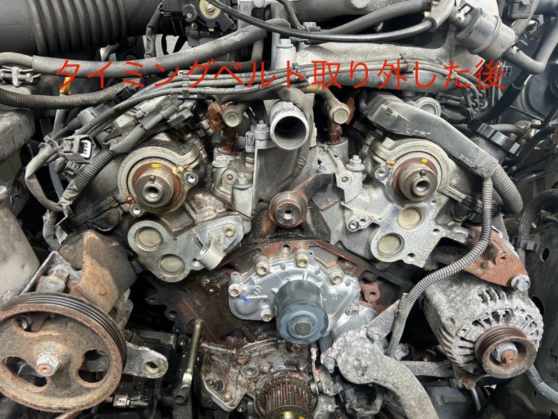 タイミングベルト、ウオーターポンプ取替後になります。取り外した補器類を元通り取り付けて完成です。