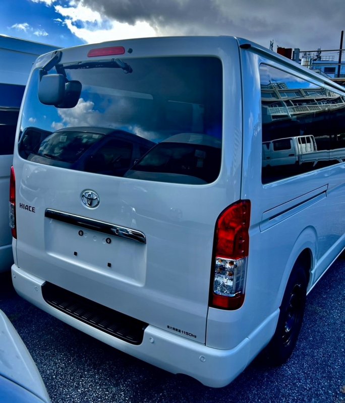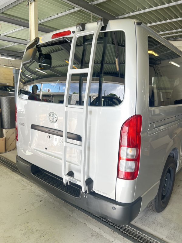 沖縄県那覇市のカーコンビニ倶楽部アニヤデンキ・ピカ店にて、トヨタ・ハイエースにリヤラダー取付・システムラック(ルーフラック4本足タイプ)取付を行いました。お客様より「業務の荷物を載せられるように積載性を向上させたい」とご相談をいただきました。