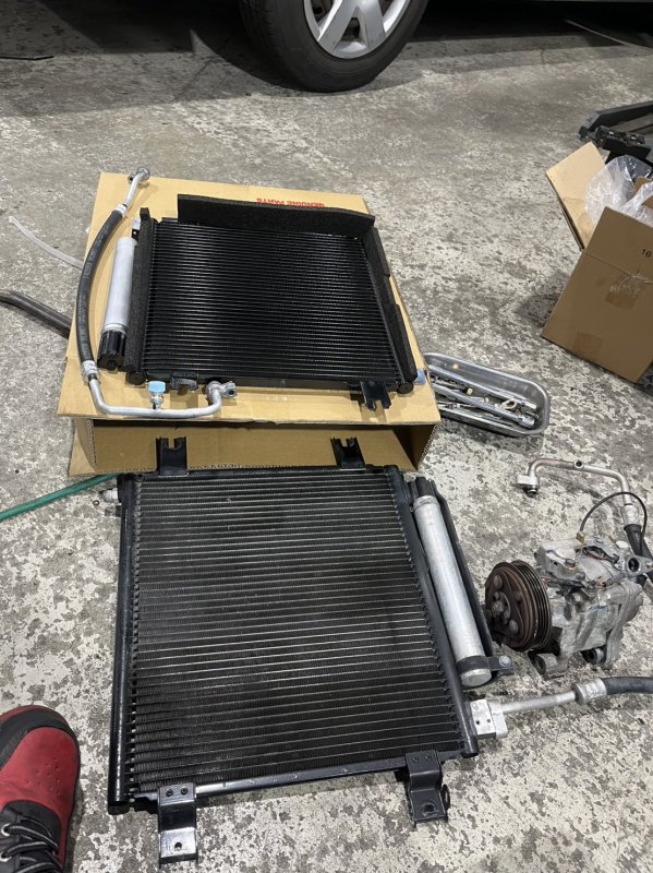 交換作業を行った、新旧のエアコン・コンプレッサーとコンデンサーです。