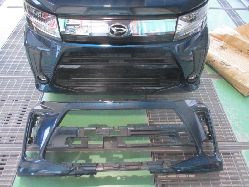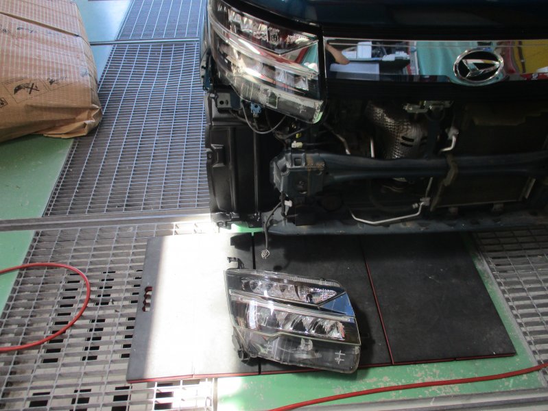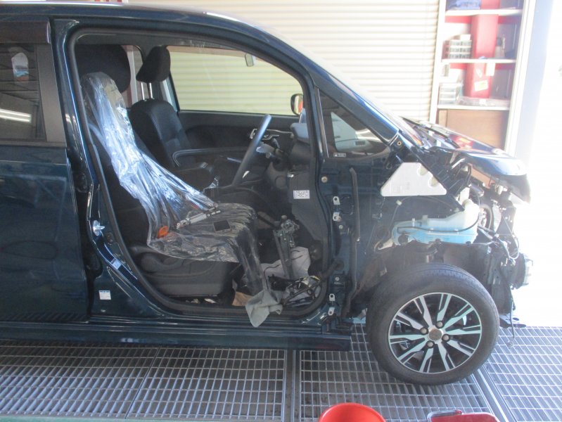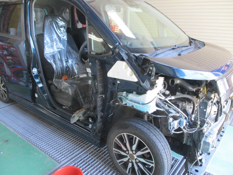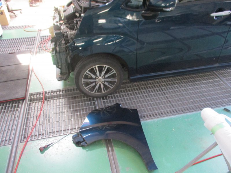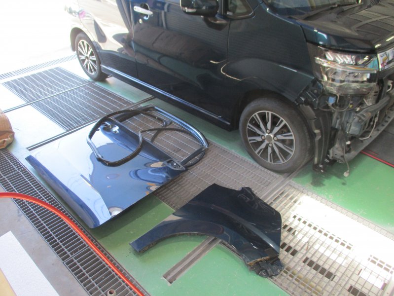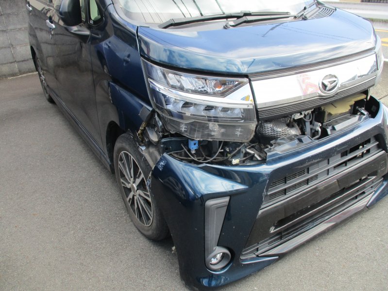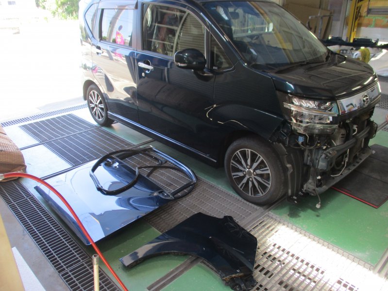 静岡県伊豆市 ムーヴ フロントバンパー、ヘッドライト、左右フロントフェンダー、フロントドア交換 ラジエータサポート板金塗装