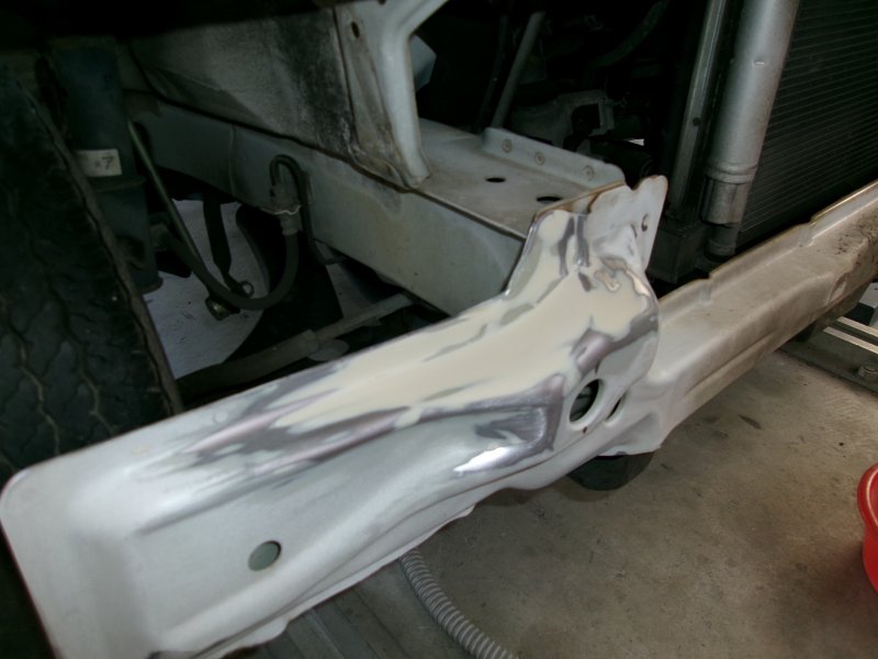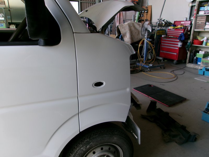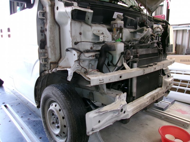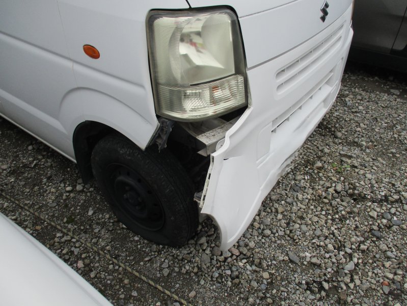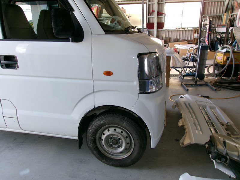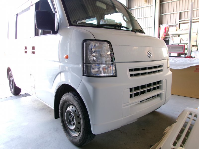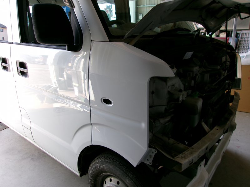 静岡県三島市 エブリー フロントバンパー、フロントフェンダー、ヘッドライト交換 ホースメント、ラジエータサポート板金塗装