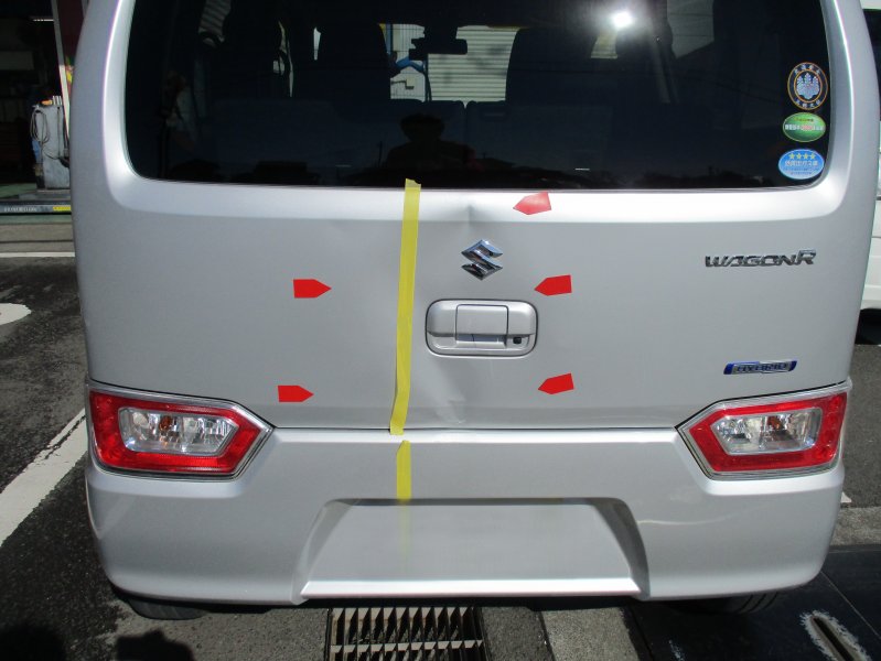 静岡県伊豆の国市 ワゴンR リヤバンパー、バックパネル板金塗装 リヤゲート交換