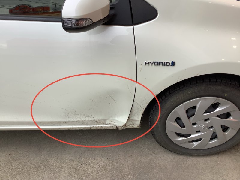 今回紹介する事例は、トヨタ アクアの右側フロントドア・フェンダー・ロッカーパネルのヘコミキズの修理となります。