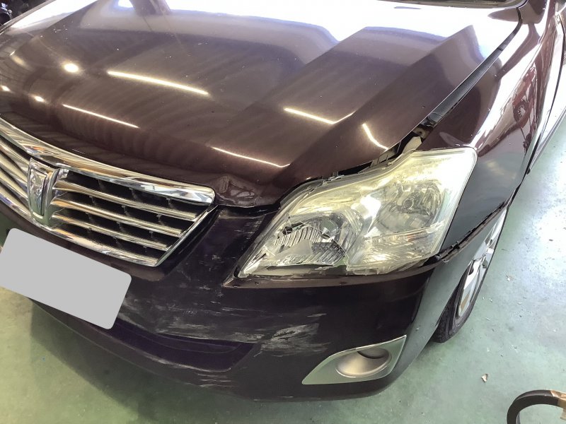 長野市小鍋:トヨタ プレミオ、フロント左側部の損傷、ボンネットフード・左フェンダー・左ヘッドライト・フロントバンパー・左フロントドア・ラジエーターグリル・フロントバンパーエネルギーアブソーバ類板金・交換塗装保険修理、型式:DBAーZAT260