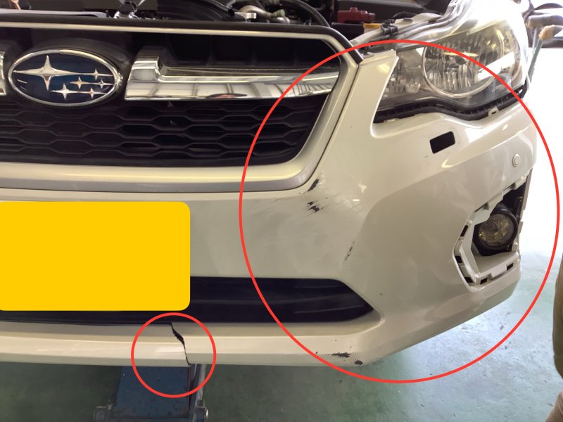 新潟県上越市:スバル インプレッサ、フロントバンパー破損フロントバンパーAssy(リサイクルパーツ)交換修復事例です。型式DBAーGP7ーB5BC