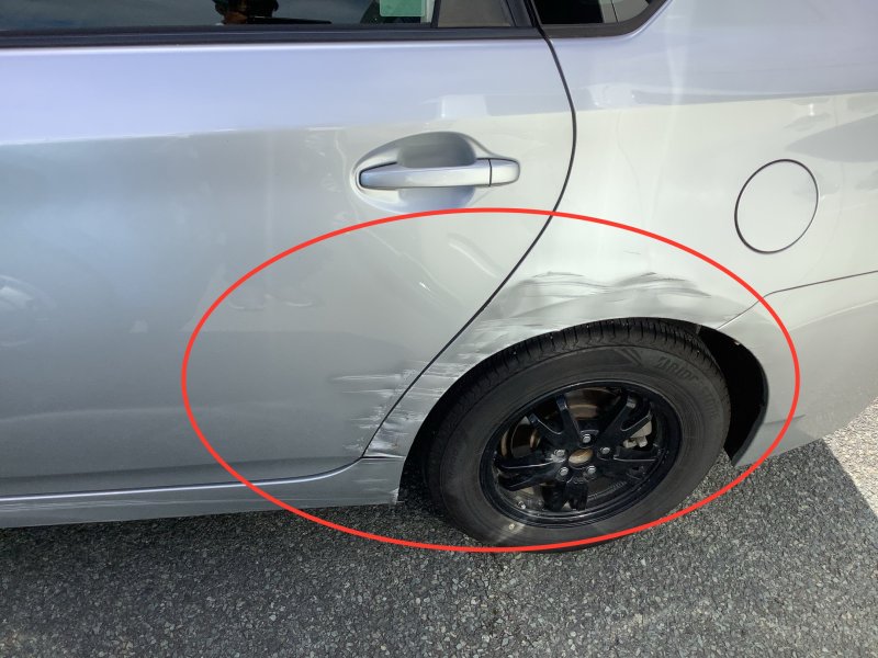 こんにちは😃今回ご紹介する事例は、プリウス左側リヤドア〜クオーターにかけて出来てしまったヘコミ傷のパテ処理作業(紫外線照射硬化中)となります。
