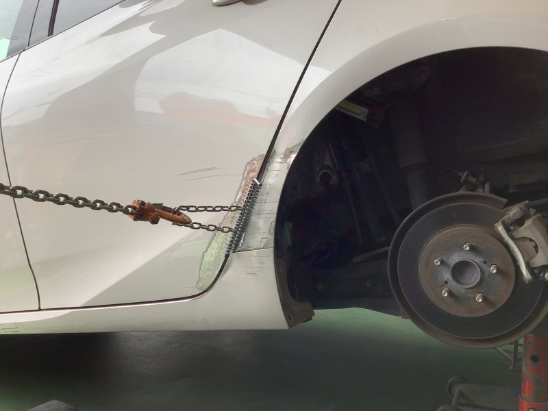 上のお写真は、専用の引き出しツールである『タワー式パネル修正機』で左リヤドアのヘコミ箇所に溶接ワッシャーを使用してチェーンで引いている風景です。力任せでなく、軽く引きながら、周囲をハンマーで叩いて歪みを直していきます。こういった技法をプッシュプル法と言います。