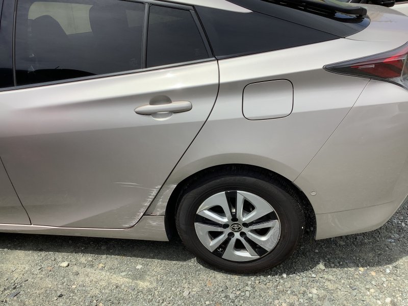 長野市上松:トヨタ プリウス、左リヤドア・左クオーターパネル板金塗装、左ロッカパネル・モールディング外傷修正塗装、純正ホイールキャップ取り寄せ交換、型式:DAAーZVW51