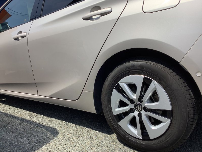 長野市上松:トヨタ プリウス、左リヤドア・左クオーターパネル板金塗装、左ロッカパネル・モールディング外傷修正塗装、純正ホイールキャップ取り寄せ交換、型式:DAAーZVW51