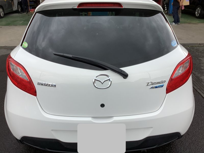 長野市今井:マツダ デミオ、バックドアキズヘコミ板金塗装・リヤバンパーキズヘコミ熱修正塗装修理事例です。型式:DBAーDEJFS