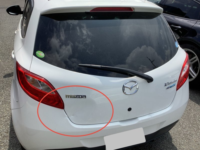 今回ご紹介する修理事例は、マツダ デミオのバックドア・リヤバンパーに跨って出来てしまったヘコミキズの修理となります。