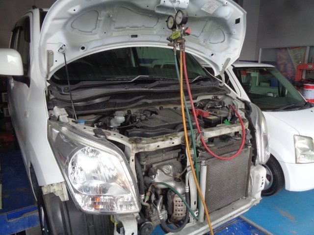 エアコンの効きが悪いとの事で、エアコンガス補充のご用命です。今回は、エアコンの効きだけでなく、燃費向上にも効果があるという「ワコーズパワーエアコン」も同時に注入します。エフェクターとも呼ばれる商品ですが、潤滑性能の高いコンプレッサーオイル成分により、コンプレッサーのフリクションを低減するというものです。写真はゲージマニホールドを接続してガス注入作業をしているところです。(他の作業の関係でフロントバンパーを外してあります)作業後、吹出口温度が21℃から15℃に低下しました。