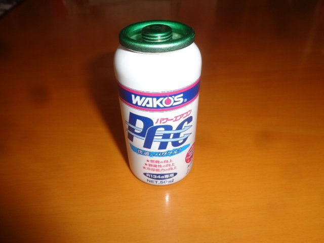エアコンの効きが悪いとの事で、エアコンガス補充のご用命です。今回は、エアコンの効きだけでなく、燃費向上にも効果があるという「ワコーズパワーエアコン」も同時に注入します。エフェクターとも呼ばれる商品ですが、潤滑性能の高いコンプレッサーオイル成分により、コンプレッサーのフリクションを低減するというものです。写真はゲージマニホールドを接続してガス注入作業をしているところです。(他の作業の関係でフロントバンパーを外してあります)作業後、吹出口温度が21℃から15℃に低下しました。