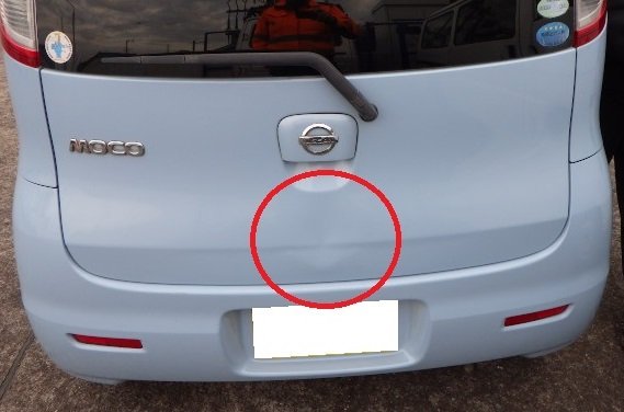 お車を確認させて頂くと、バックドアの下側に手のひらサイズのへこみが確認出来ました。