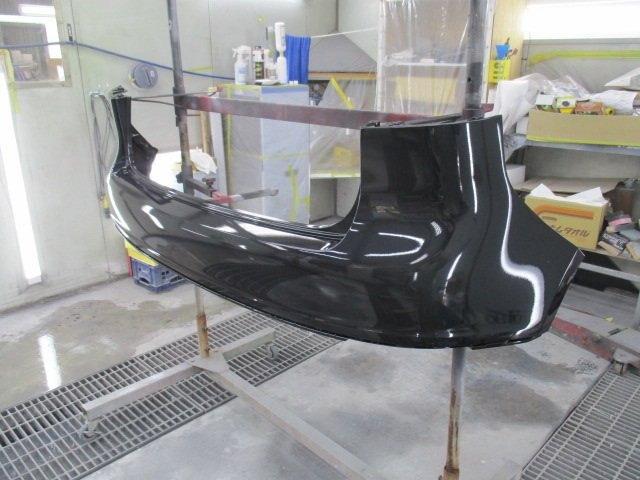 新しいリアバンパーを調色したカラーで塗装し、クリアを噴きかけツヤと光沢を出して取付け致します。