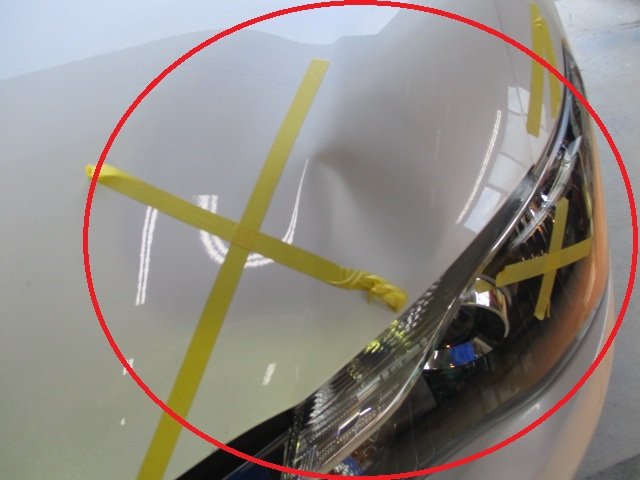 お車を確認させて頂くと、フロントバンパー・フロントグリル・左右ヘッドライト・左右フェンダー・ボンネットにキズへこみが多数確認できました。