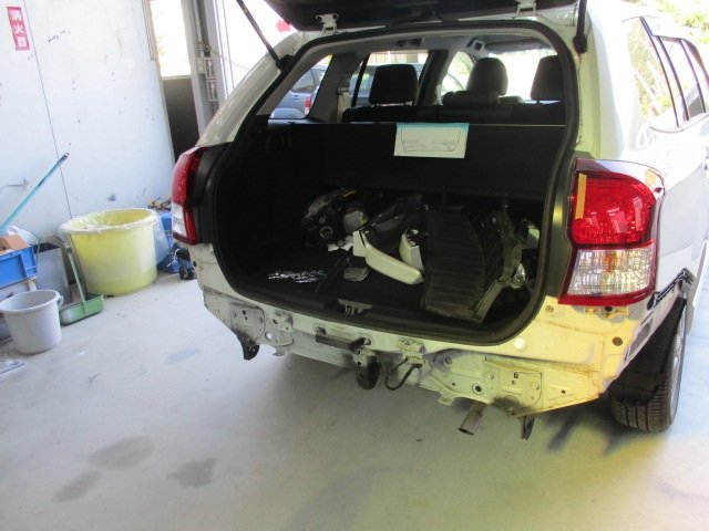 リア部分は、リアバンパーやテールランプを取外し、バックドアを鈑金修理していきました。