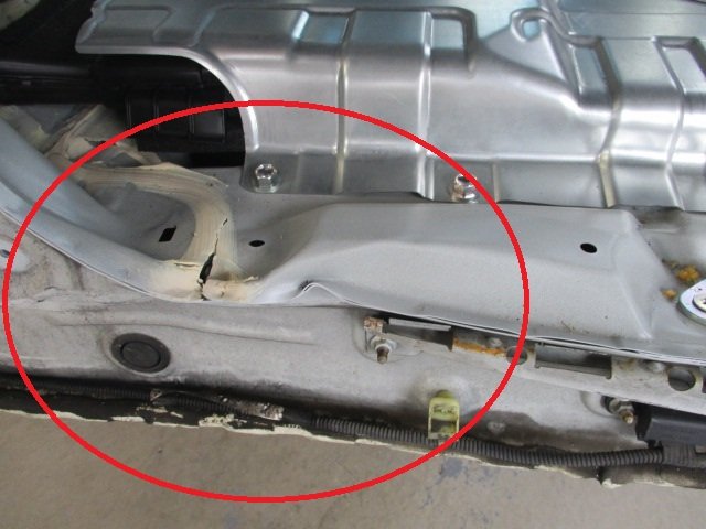 お車を確認させて頂くと、リアバンパーとバックドア左側にへこみキズが付いていました。また、リアバンパーを外して確認するとエンドパネルに亀裂が入っており、トランクフロアに歪みが出来ていました。
