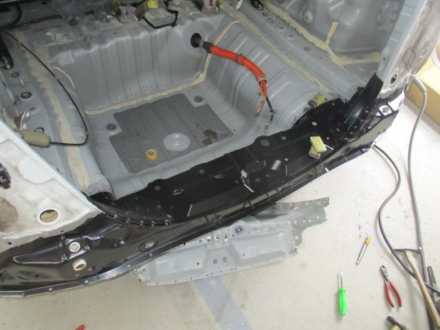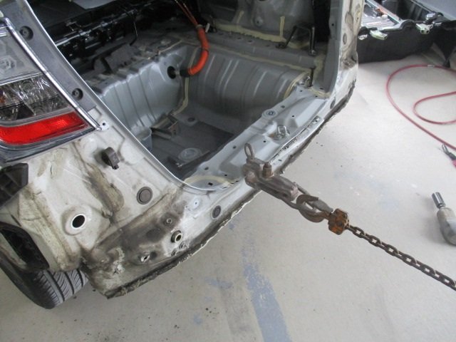 先ずは、トランクフロアの歪みを修正するため、フレーム修正機を使い引っ張り出しました。その後、トランクフロアを鈑金修理し、エンドパネルは交換修理を行いました。