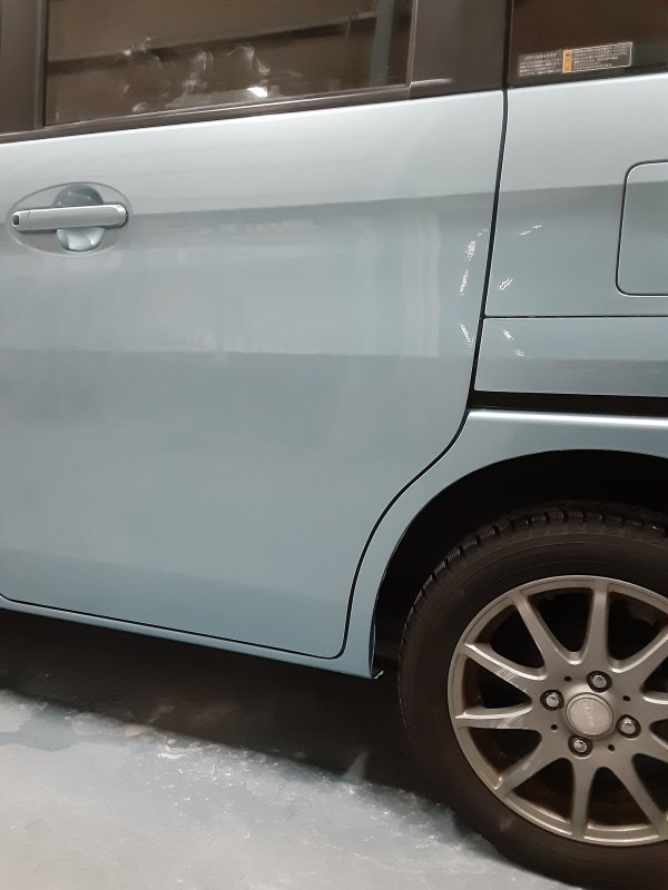 富山県 氷見市 スズキ スペーシア 左リア スライドドア ハウス すり傷 へこみ 車の修理 軽自動車 縁石