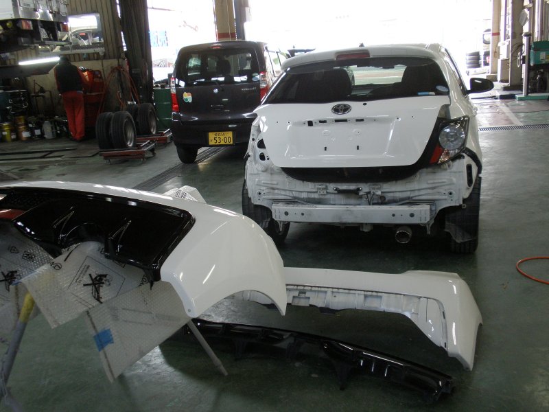 バンパーのアッパー(白いところ)とロワー(黒いところ)の交換作業とバックドアに小さな凹みがあります。