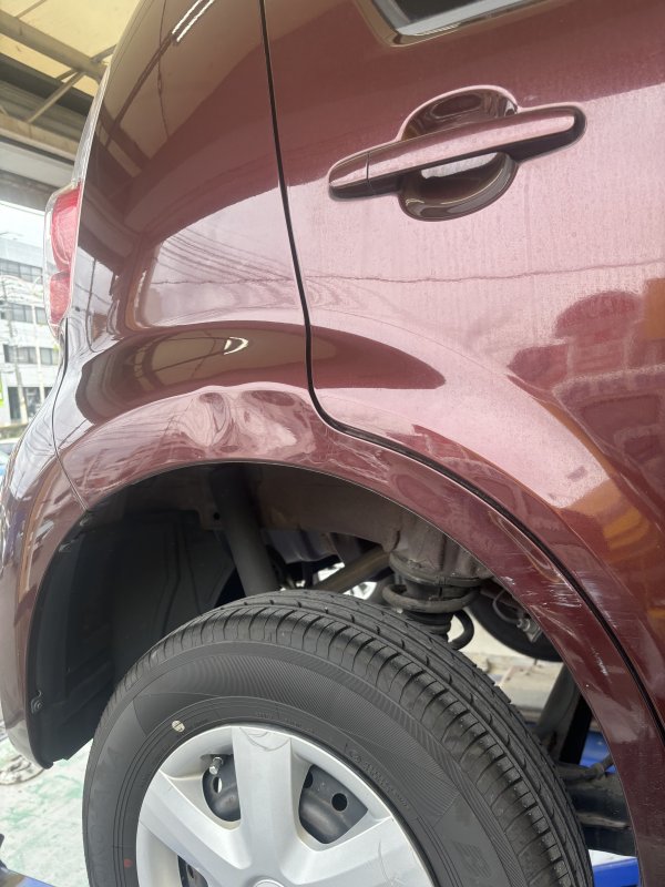 運転席側のリアフェンダーをポールなどに当ててしまい、変形ができたため、修理のご相談でご来店いただきましたまし