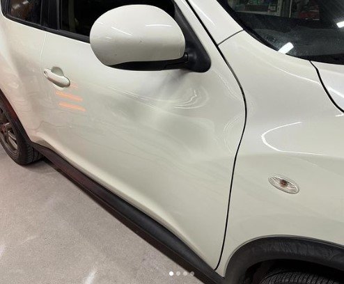 福岡県太宰府市|ジューク(日産)のキズ・へこみ直し事例(右前後ろドアパネル キズ ヘコミ 車 修理 鈑金)