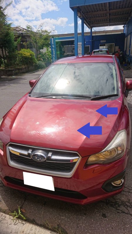 お車はスバル インプレッサ。日頃よりメンテナンスなどで当店をご利用いただいているお客様より、ボンネットに付いてしまったキズ・ヘコミ、ならびに塗装剥がれについて修理のご相談をいただきました。