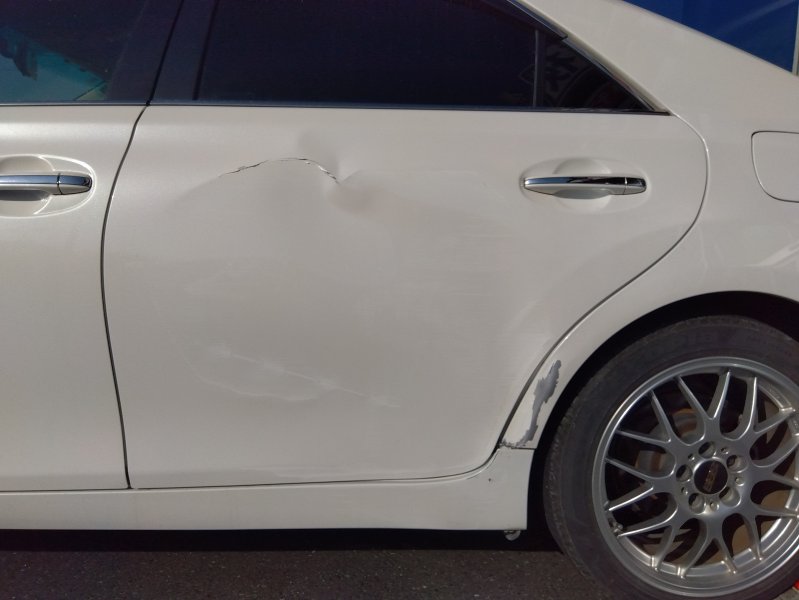 ドアの凹みの範囲が広く、パテ埋めでの工程ですと強度が弱く、後にひび割れになりかねません。ご提案させていただきましたのは中古品のドアを使用すること。お客さまにもご理解いただき、中古品パーツを探しました。同色で綺麗なドアが届きましたので仕上げに磨きをしています。クオーターとサイドスポイラーは板金塗装しています。ディーラーではすべてが新品交換となるため高額となります。当店では中古パーツも扱っておりますので、修理金額を抑えたい方にお勧めです。