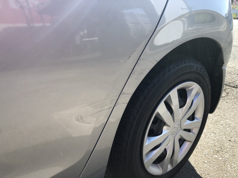〔愛知県豊橋市 格安・美麗〕フィット(ホンダ)のキズ・へこみ直し事例(左リアドア、リアクォーター凹み修理)
