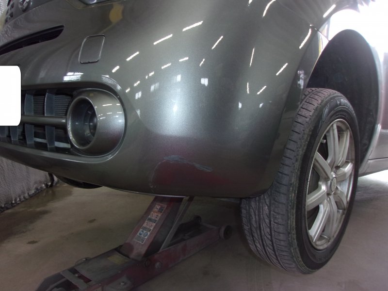 群馬県桐生市|キューブ(日産)のキズ・へこみ直し事例(フロントバンパー 左側のキズ・へこみ直し)