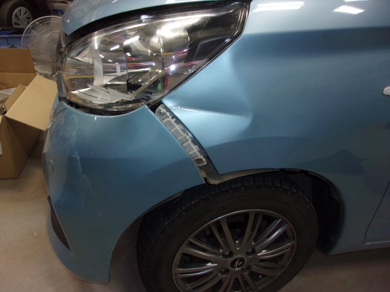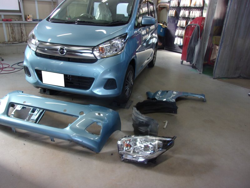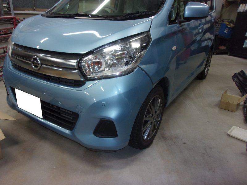 群馬県桐生市|デイズ(日産)のキズ・へこみ直し事例(フロントバンパー、左ヘッドライト、左フロントフェンダー キズ・へこみ)