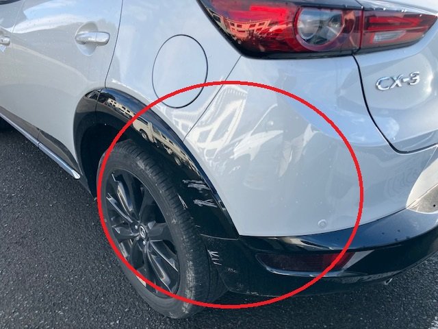千葉市|千葉市若葉区|マツダ CX-3 リヤバンパー 左オーバーフェンダー 板金 鈑金 修理 キズ へこみ キズ修理 へこみ修理 取替 交換 保険 保険修理